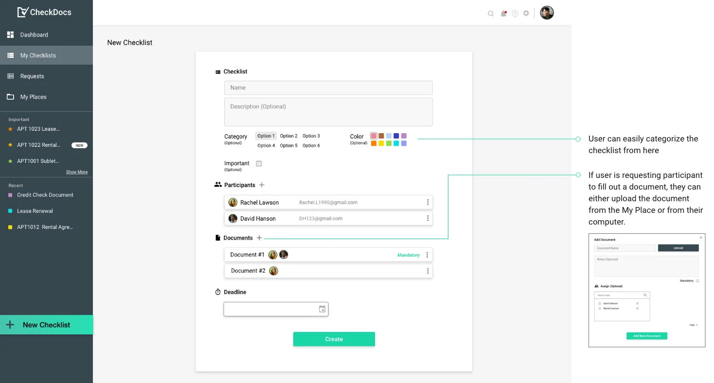 CheckDocs can help users share contents seamlessly. When people share content-heavy documents, such as leasing, legal, or audit working papers, it is difficult to keep track and be organized. Statistics also show people use an average of three different content repositories, which can be problematic when sharing documents. My target objective is to create a web-based application where users can share and manage documents efficiently.